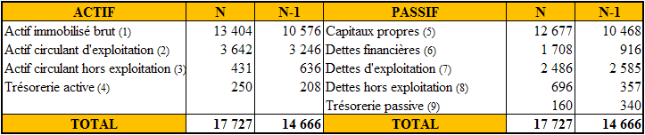 | (7) Dettes fournisseurs + Dettes fiscales et sociales + Autres dettes + Provisions pour charges |
